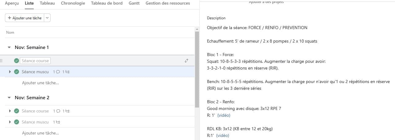 Ensuite, je réalise tes entrainements, mois par mois, que je te transmets directement sur une application interactive gratuite (ASANA). Ce qui te permettra de me faire tes retours, séances par séance. Dans ces séances, tu y retrouveras toutes les informations nécessaires à la compréhension du programme. Je te mets des vidéos démonstratives des exercices que tu ne connais pas, pour être sur qu'on collabore au mieux.